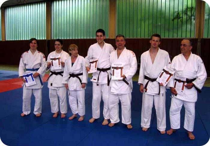 Von den über 25 Lehrgangsteilnehmern traten nur 8 zur Prüfung zum 1. Kyu an, alleine sechs aus Jülich. Außerdem Jona um