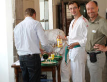 Gerda Mojert ließ es sich nicht nehmen, dem Jülicher Judoclub vertreten durch Leander Fürst und Gertrud Jongedyk einen Judoanzug zu