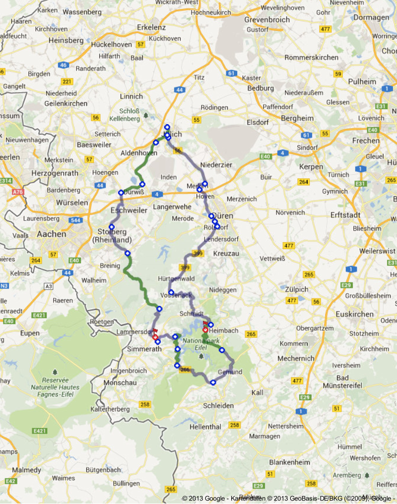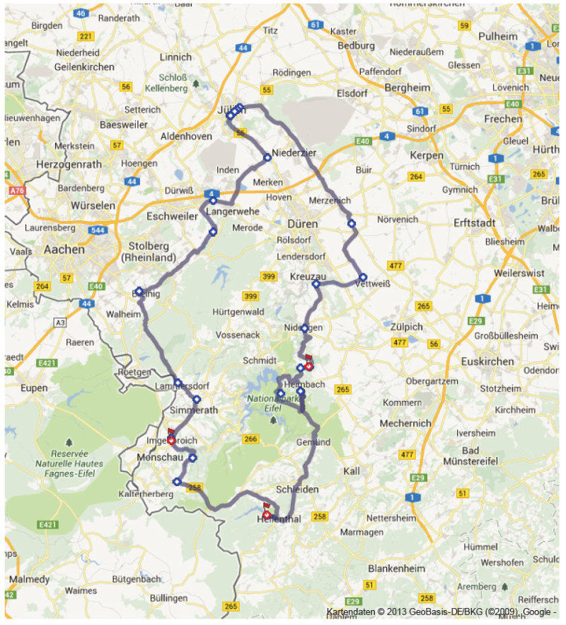 Route: Jülich, Kreuzau, Roetgen, Eupen, Jalhay, Sart-le-Spa, Spa, La Rein, Aywaille, Stoumont, Tre