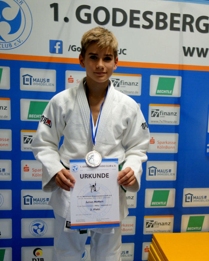 Zu den Nordrhein-Einzelmeisterschaften der U13, ausgerichtet vom Godesberger JC, hatten sich zwei Jülicher Judoka über die Kreis- und Bezirksebene qualifiziert. Dies ist für diese Altersklasse die höchste Ebene im Judo. Carola Korte musste leider aus Gewichtsgründen gegenüber dem Bezirk eine Gewichtsklasse höher starten. Mit zwei gewonnenen Kämpfen aus vier Begegnungen konnte sie den beachtlichen 7. Platz in der Klasse bis 33 kg in ihrem ersten Jahr in dieser Altersklasse erreichen. Für Julian Meffert, der sich als 3. des Bezirkes für die Gewichtsklasse – 46 kg qualifiziert hatte, lief es runder. Nach zwei Siegen in der Vorrunde stand er im Finale, das er gegen K. Distel (1. des Bezirkes Düsseldorf) durch ein Ippon vorzeitig verlor. Mit ihm freute sich Coach L. Fürst über den Nordrhein-Vizemeistertitel.